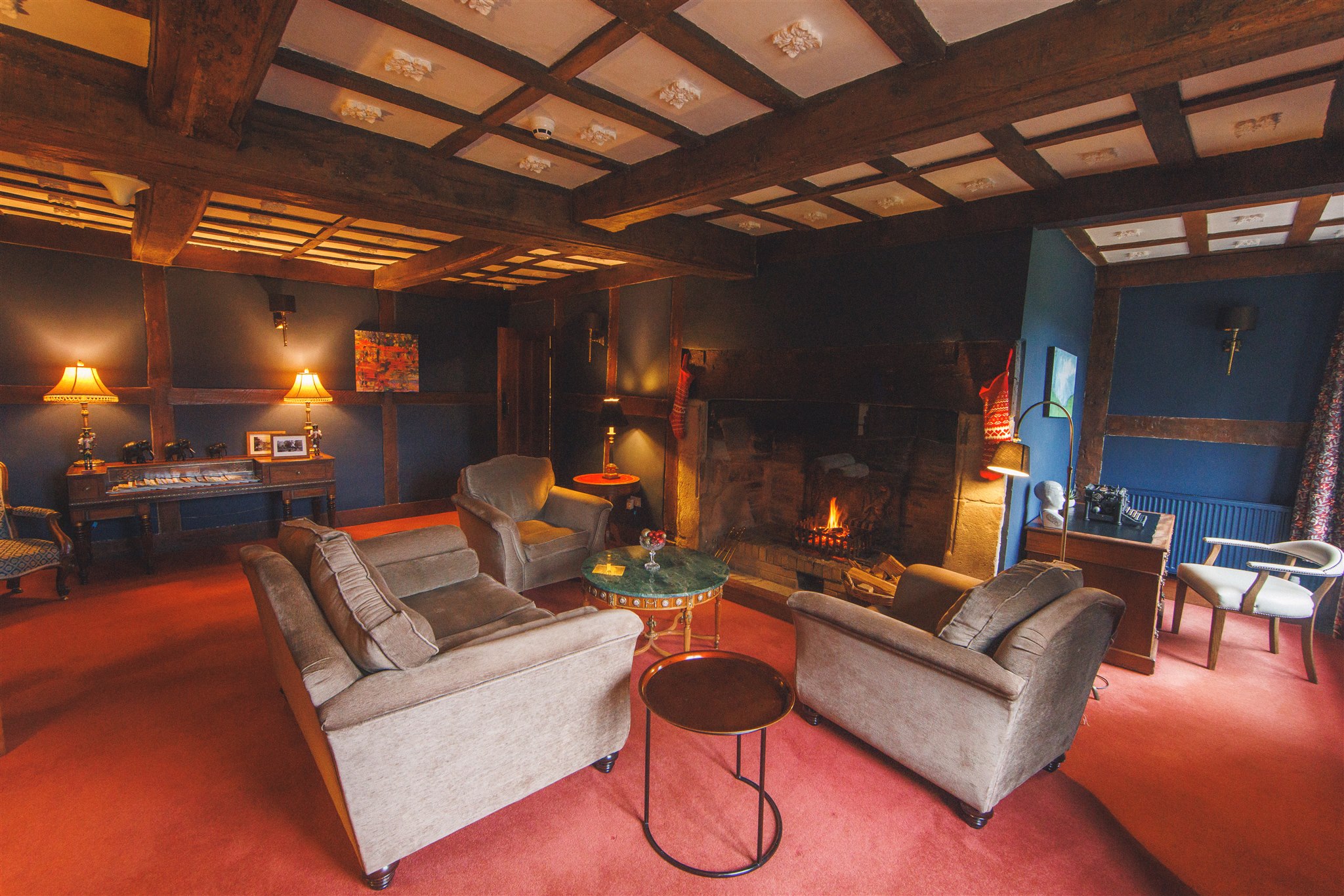 Bowley Hall is a beautifully restored 14th Century Manor House set in beautiful gardens and grounds. On the ground floor, three different sitting areas await: the decadent navy blue lounge, perfect for whiling away the hours in front of a roaring fire; the inner hall for pre-dinner drinks with the summer sun flooding in; and the snug - a cosy room to read, catch up on some TV, or for children to play.