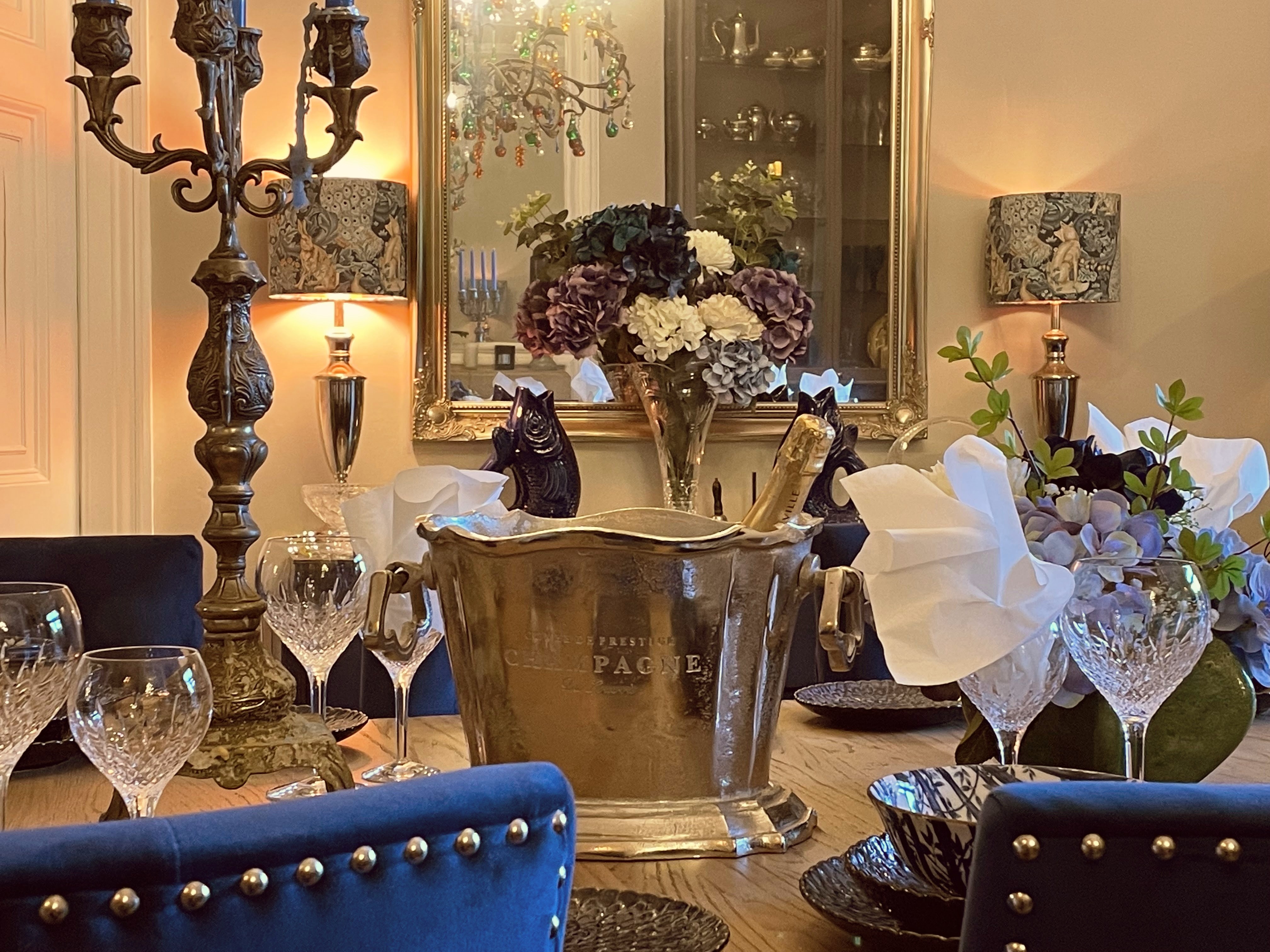 Crystal glassware, candelabra and flowers - luxury dining for 18 beneath ornate mirrors