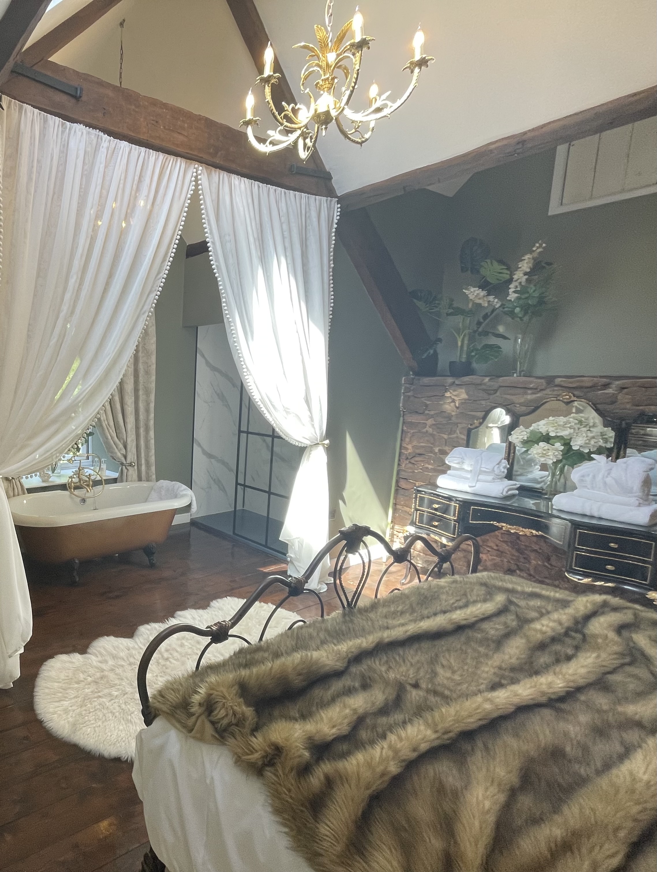 Freestanding copper bathtubs, ornate beams and elegant drapery