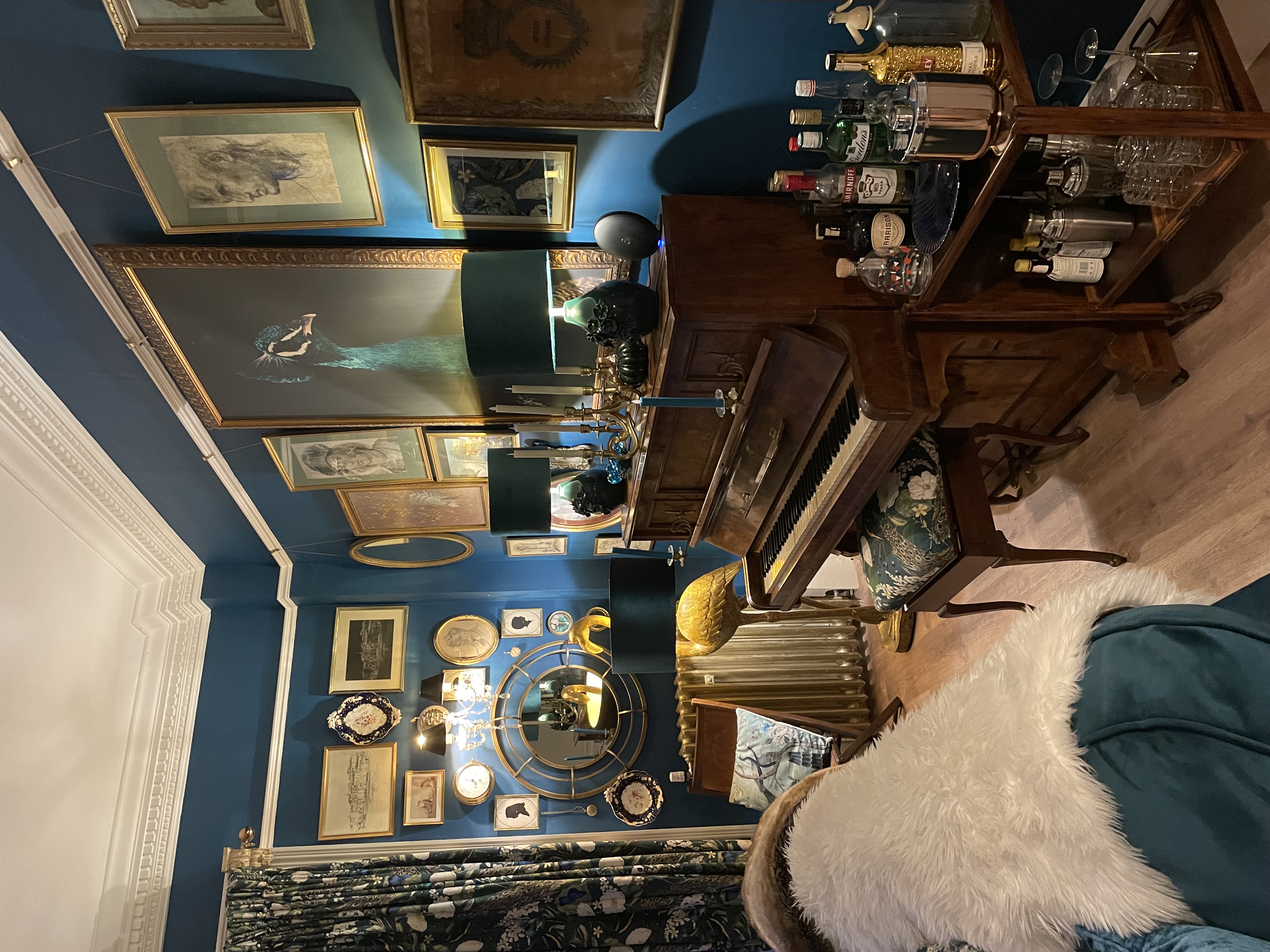 Grand piano, gallery of portraits, navy blue walls and vintage furnishings