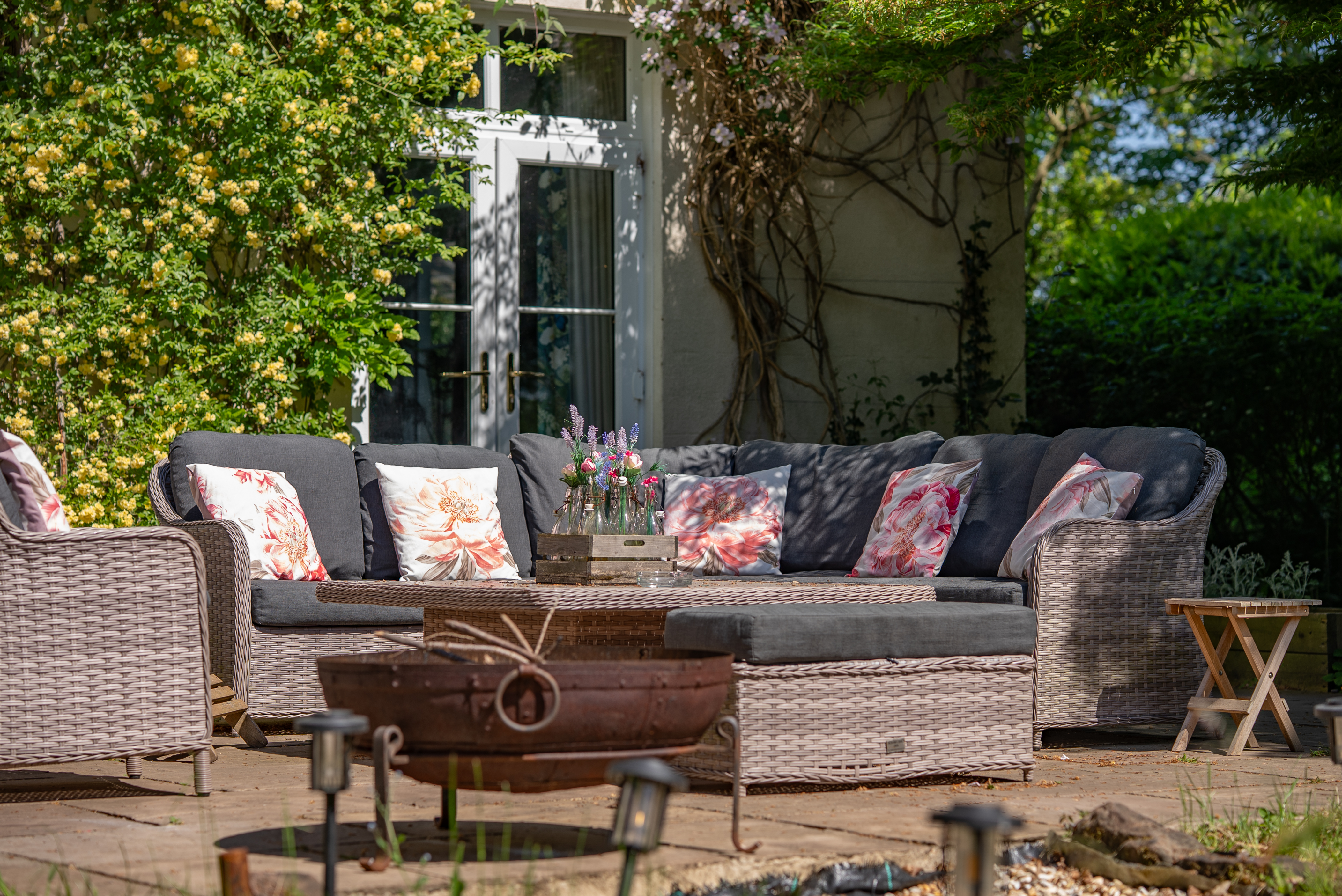 Step outside to mature landscaped gardens with established hedges, winding pathways and colourful foliage. There's a furnished patio for outdoor dining, a barbecue for summer evenings, and a hot tub overlooking pastoral countryside towards the Brecon Beacons.
