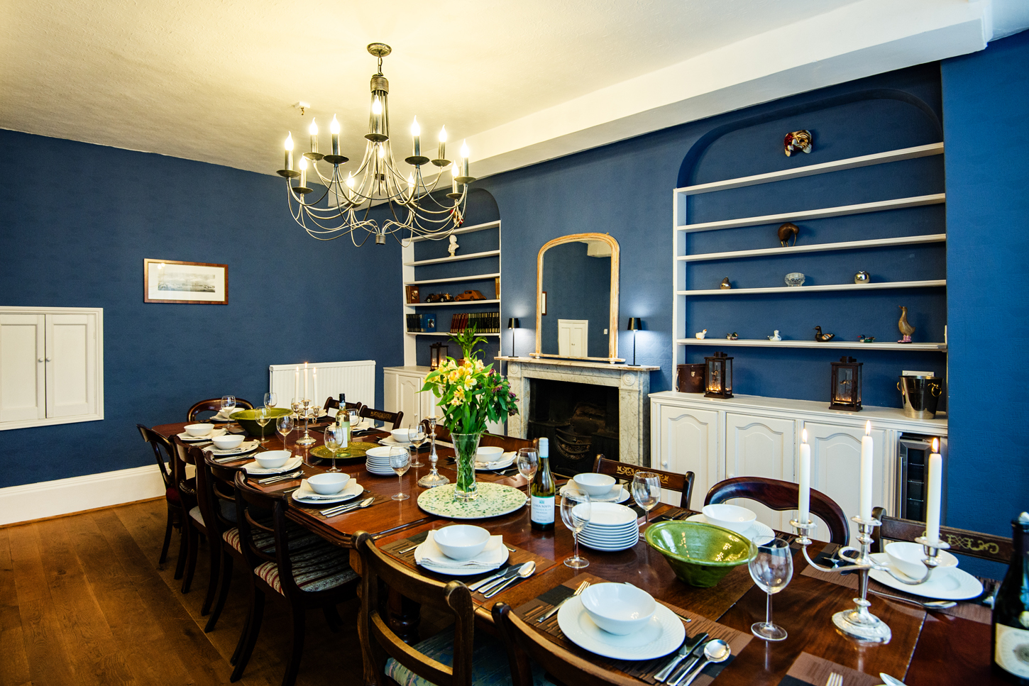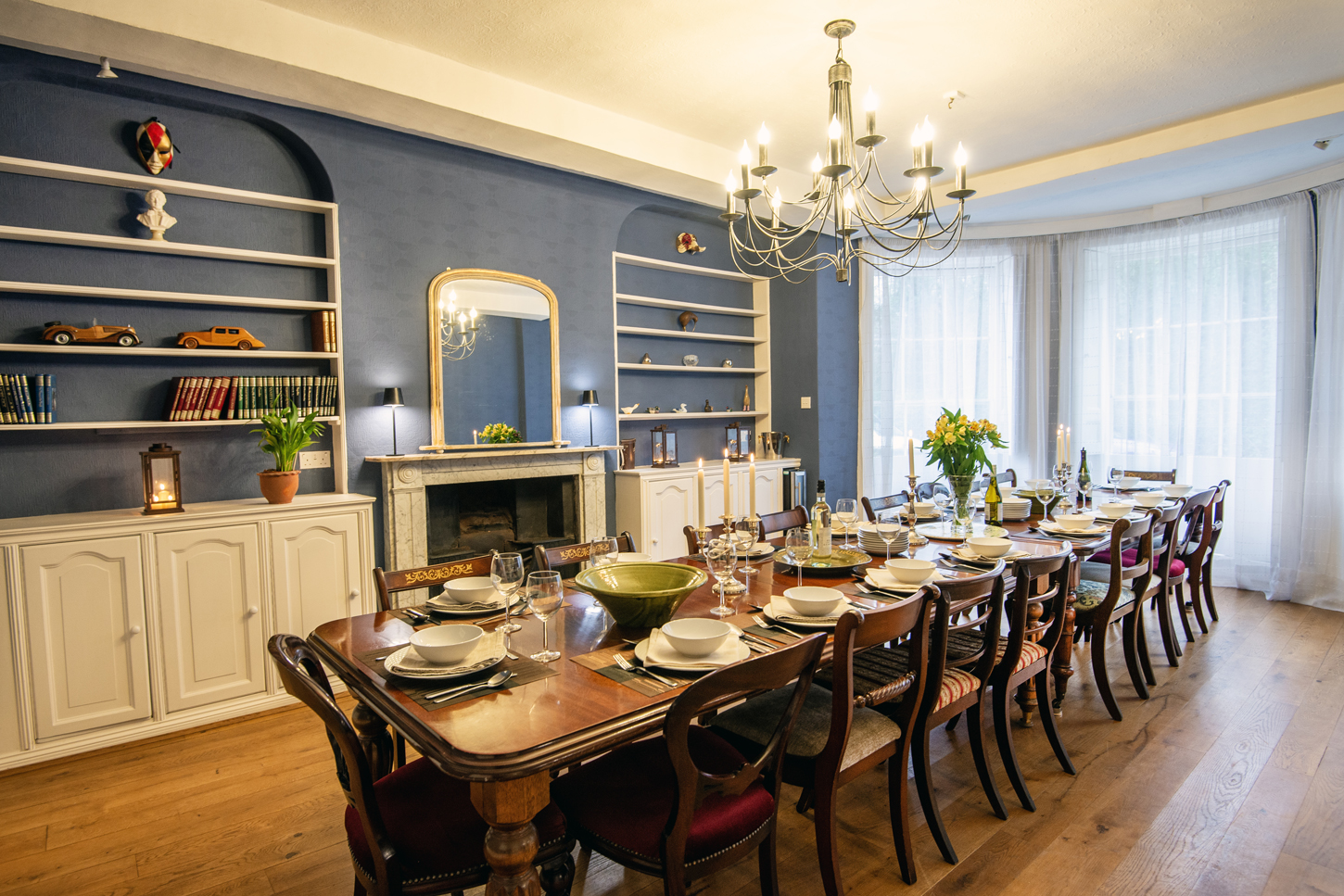 The formal dining room sets the scene for memorable dinners and celebrations. Twenty-four seats around one magnificent table, a roaring fireplace, and crystal chandelier overhead. Whether it's Christmas dinner, a milestone birthday feast, or just a long lazy Sunday lunch, this is where the magic happens.
