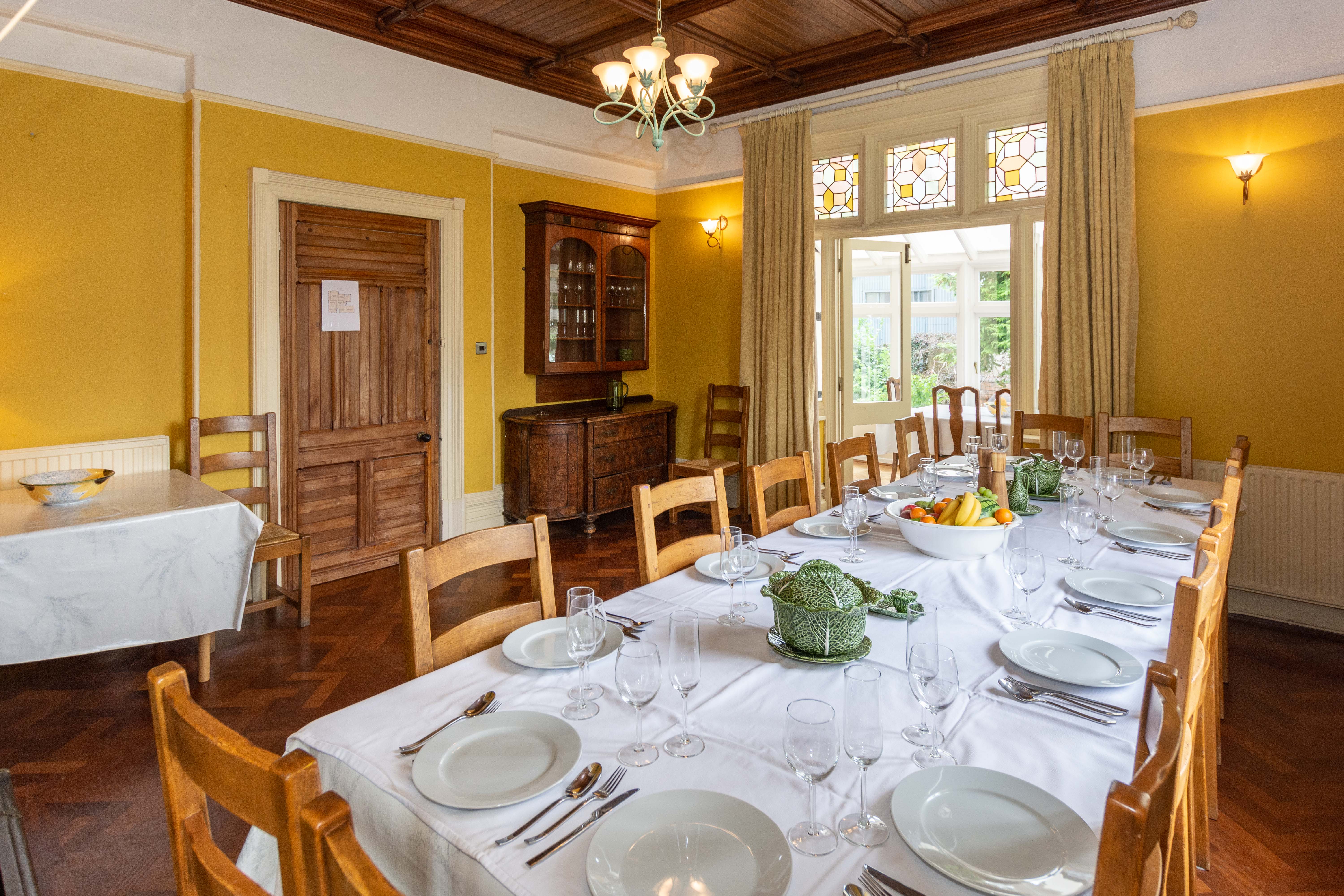 Two connected dining rooms with space for everyone around one table