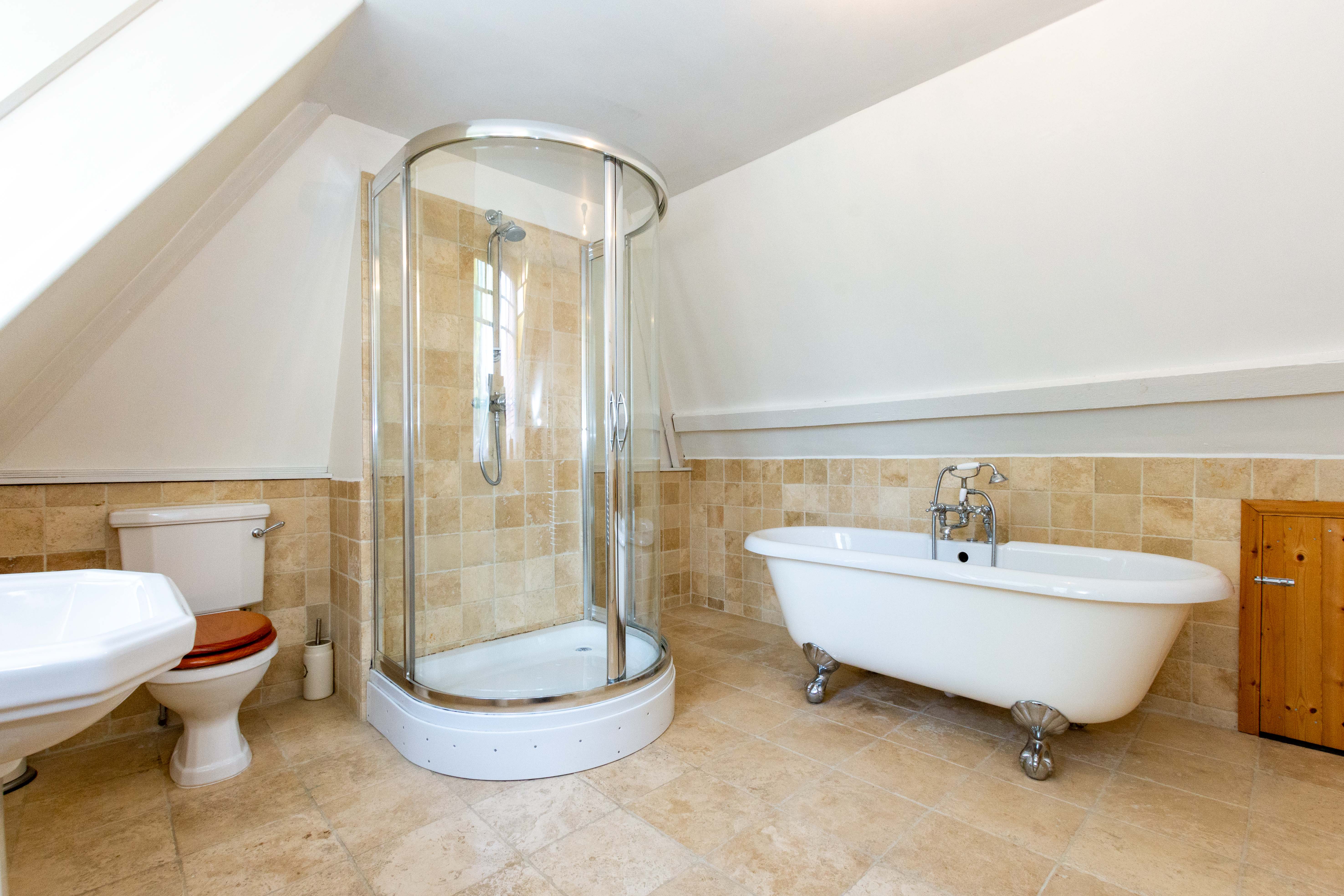 Eight bathrooms across the house - from a vintage Victorian bath with decorative tiling and its own fireplace to modern walk-in showers and a luxury freestanding tub. The first floor family bathroom incorporates the sauna alongside a Victorian bath. No queuing for the shower, even with 24 guests.