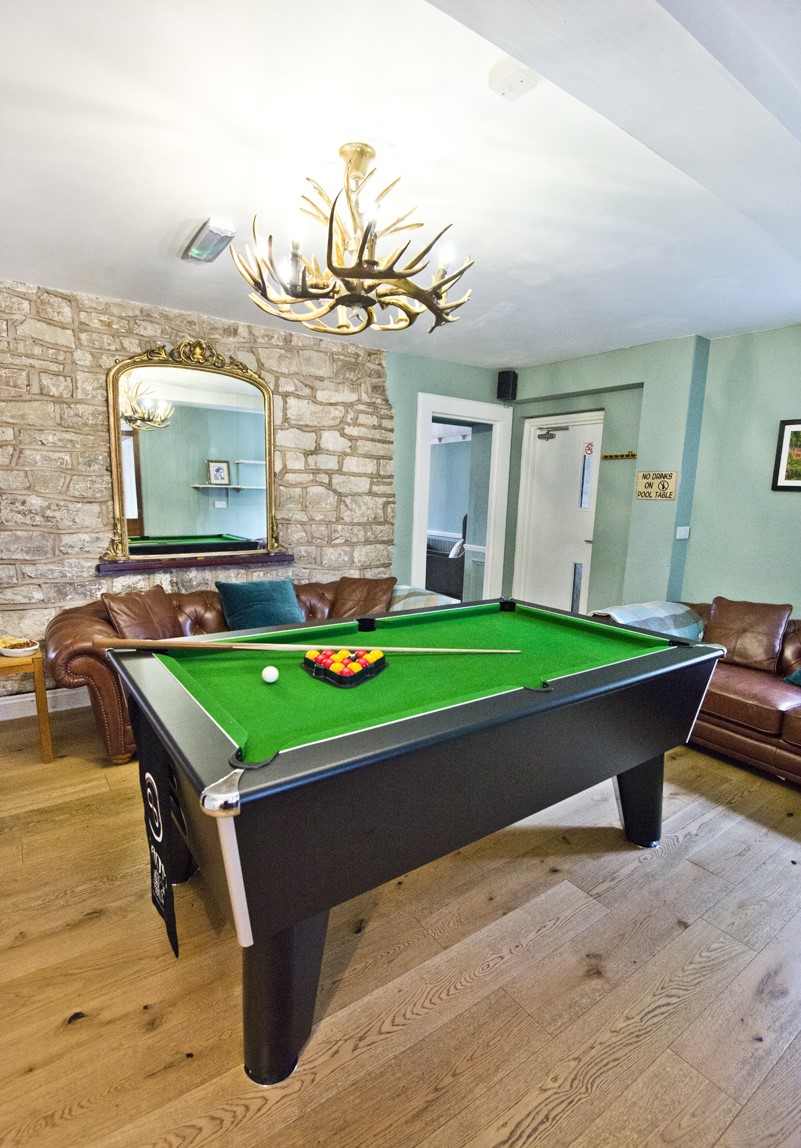 Slate bed pool table with quality cues, leather seating, stone accent wall and antler chandelier.