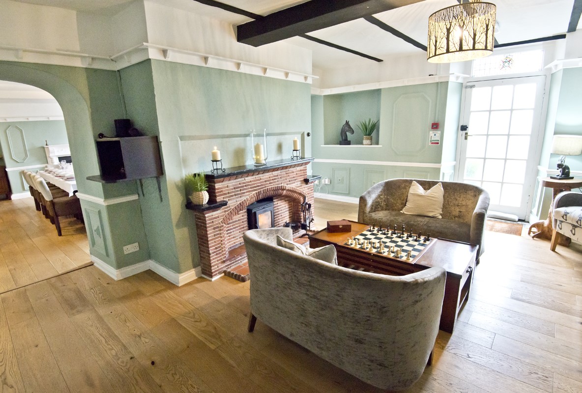A quiet TV lounge for board games and sport, plus an elegant music room with log burner and chess table.