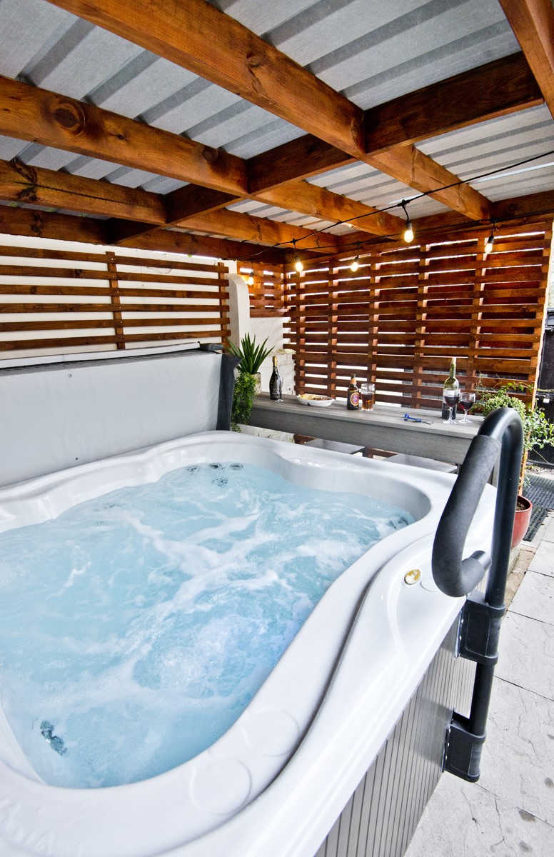 A covered hot tub area with pergola for chilling after a day exploring the forest.