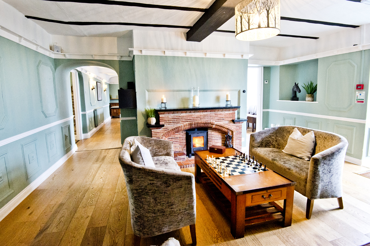 An elegant lounge with log-burning stove, chess table, and the kind of deep armchairs that swallow you whole. A quiet space for conversation.