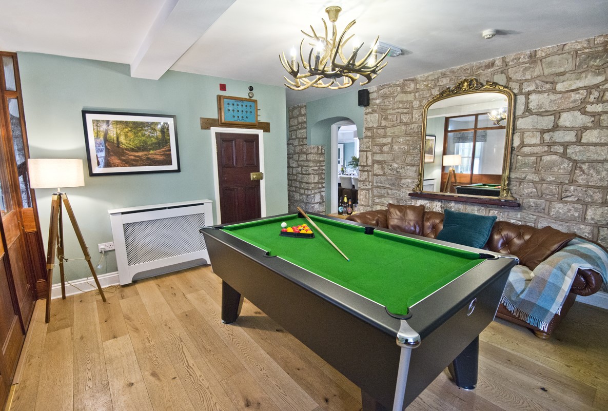 Games room with slate bed pool table for entertainment.