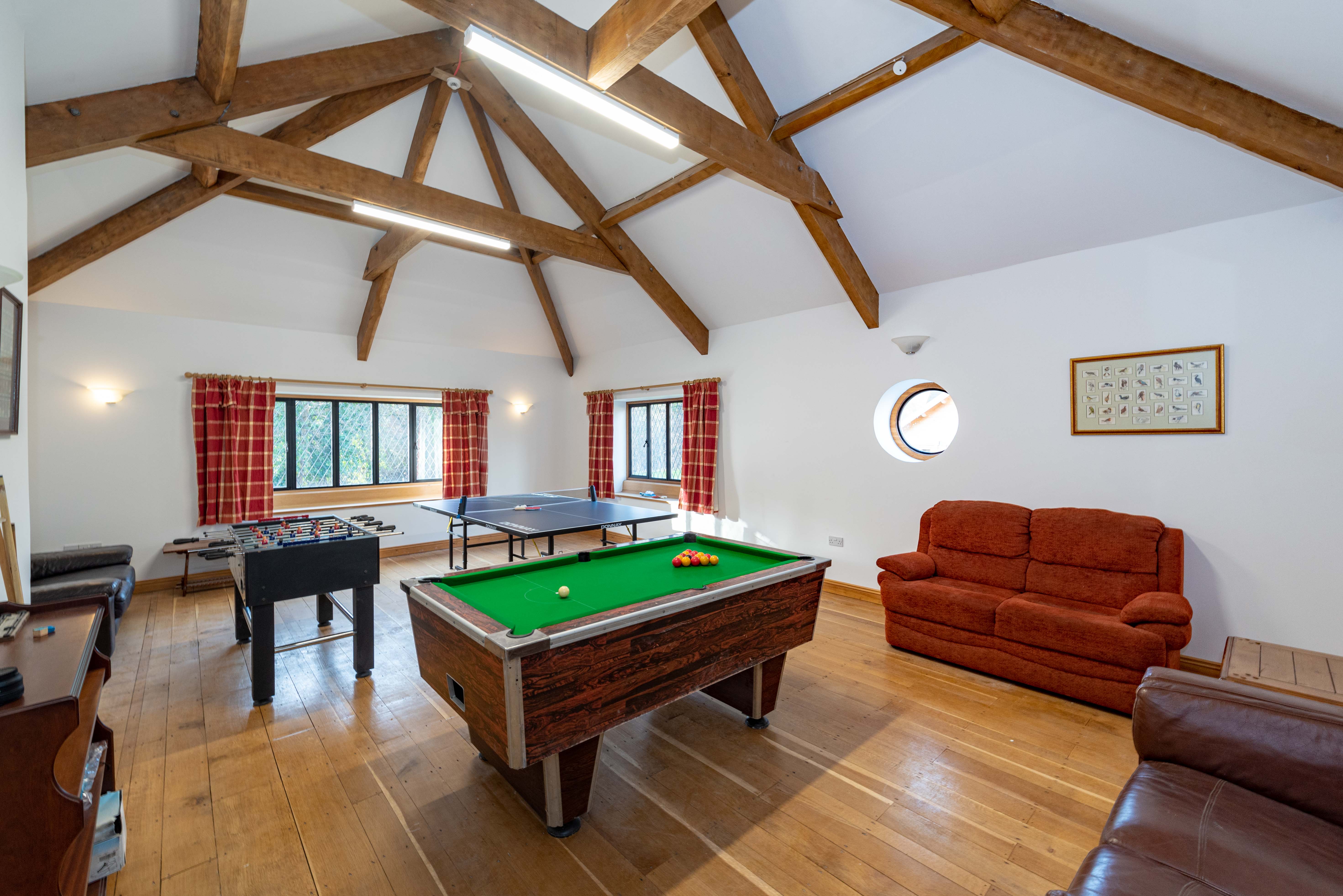 Pool, table tennis, and table football under exposed timber beams